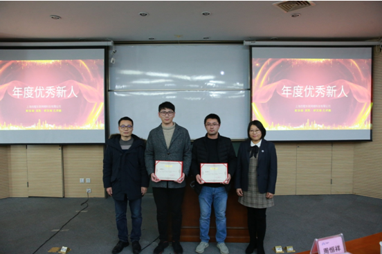 優(yōu)秀新人獎(jiǎng)(從左到右為李陽(頒獎(jiǎng)人員)孔祥彪、袁凱、黃梅霞(頒獎(jiǎng)人員))
