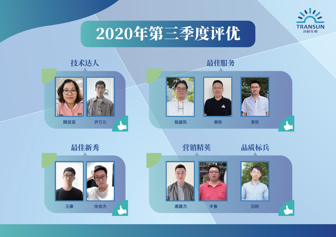 經(jīng)過層層篩選,第三季度優(yōu)秀員工評選活動已圓滿落下帷幕,他們分別是:技術(shù)達(dá)人魏苗苗,尹萬元,品質(zhì)標(biāo)兵田剛、最佳服務(wù)殷盛凱、黃新、袁凱,最佳新秀王康、徐俊杰,營銷精英唐嘉杰、辛魯。他們用實(shí)際行動證明了在平凡的崗位上也能做出不平凡的貢獻(xiàn),是大家學(xué)習(xí)的榜樣和楷模。
