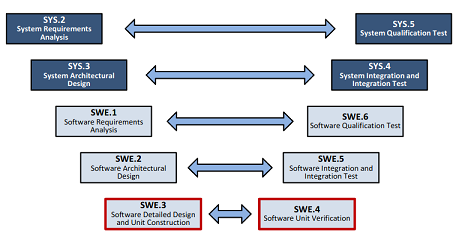 ASPICE 建立在 V 模型之上,它需要與每個(gè)開發(fā)階段相對(duì)應(yīng)的測(cè)試階段。 這是一個(gè)嚴(yán)格的模型,需要嚴(yán)格的評(píng)估以確保持續(xù)的評(píng)估和發(fā)展。下圖是ASPICE中定義的典型開發(fā)流程: