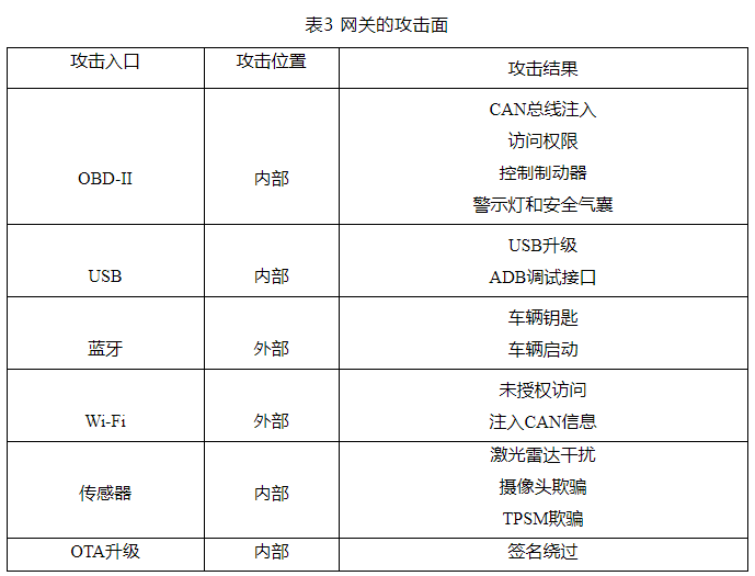 網(wǎng)關(guān)也是智能汽車最可能成為網(wǎng)絡(luò)攻擊的目標,網(wǎng)關(guān)一般是RTOS系統(tǒng),能夠弄清楚他的指令集是關(guān)鍵,網(wǎng)關(guān)的主要攻擊面(非詳盡),如表3所示。