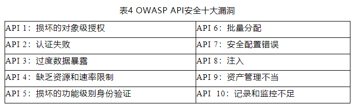 TSP是重要的車聯(lián)網(wǎng)云服務(wù),一般云服務(wù)存在的安全風(fēng)險,TSP同樣存在,可以參考OWASP Top 10。云端主要靠提供應(yīng)用程序編程接口(API)與其他端進行通信,API位于應(yīng)用程序之間或者充當處理系統(tǒng)之間數(shù)據(jù)傳輸?shù)闹虚g層,它提供了一個簡單而高效的接口,用于擴展功能和改善聯(lián)網(wǎng)汽車體驗。API安全不是汽車網(wǎng)絡(luò)安全獨有的,更多API安全可以參考OWASP API安全十大漏洞,如表4所示。