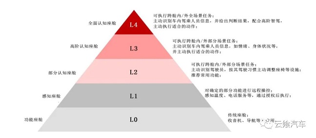 按其實現(xiàn)的能力對智能座艙進行分級,從人機交互、網(wǎng)聯(lián)服務(wù)、場景應(yīng)用與拓展三個維度進行劃分,將其分為L0-L4這五個層級。