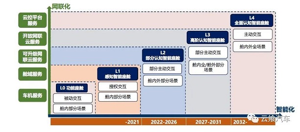 作為汽車智能化的具象體現(xiàn),在智能座艙的發(fā)展中,其路線可參考下圖的規(guī)劃,當前智能座艙所處階段為L2。