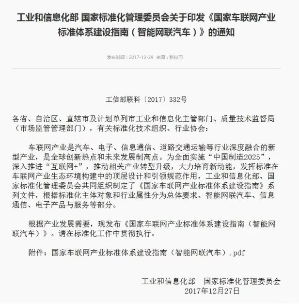 日前,工業(yè)和信息化部國(guó)家標(biāo)準(zhǔn)化管理委員向各省、自治區(qū)、直轄市及計(jì)劃單列市工業(yè)和信息化主管部門(mén)、質(zhì)量技術(shù)監(jiān)督局(市場(chǎng)監(jiān)管管理部門(mén)),有關(guān)標(biāo)準(zhǔn)化技術(shù)組織、行業(yè)協(xié)會(huì)下發(fā)了《國(guó)家車(chē)聯(lián)網(wǎng)產(chǎn)業(yè)標(biāo)準(zhǔn)體系建設(shè)指南(智能網(wǎng)聯(lián)汽車(chē))》的通知。