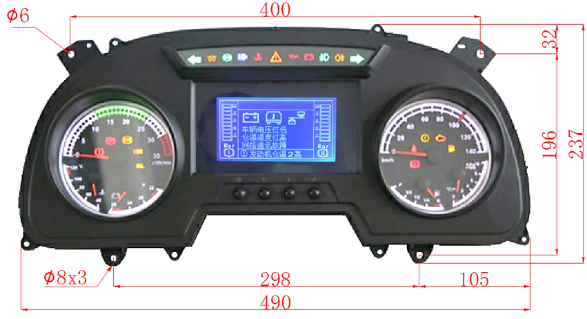 - 6個步進電機驅(qū)動的指針表盤 - 24個LED符號片 - 多個TFT符號片 - 5寸TFT彩色液晶屏 - 一個多音頻蜂鳴器 |